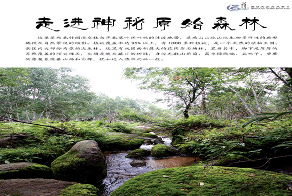 特色1:塞外版纳 花的天下 绿的海洋 走进圣境道须沟,,沐浴森林山水灵韵;;;;;特色2:自然大氧吧 花的天下 尽享山水之灵韵,,爽感自然之气息;;;;;特色3:八部水韵? 六部山魂;;;;;特色4:烟波浩淼,,水天一色;;;;;特色 5:中国最大的花岗岩石塘林,,溪水、森林、湿地、亚高山草甸等多种生态情形的完善融合之地;;;;;特色 6:塞外纯自然绿色无污染的山野菜;;;;;特色7:集中展示天下各地水车文化主题;;;;;